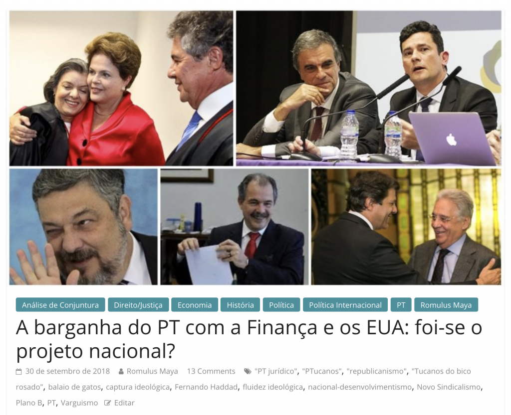 99,99999% da esquerda brasileira ainda não aceita que o Golpe foi contra a Burguesia Braileira apenas pelo fato de 99.99999% da Burguesia Brasileira ter apoiado o Golpe. Ela apoiou o Golpe mas o golpe não é dela; essa é a característica ucraniana do golpe Brasileiro, dado pela mesma equipe de neocons. Burgueses graúdos já sofreram arbitrariedades nas mãos das milícias fascistas imperiais organizadas pelo Ministério Público e pelo Mussolini de Maringá que transformaram o brasão da República em suástica. Essa justiça fascista foi elogiada pelo candidato do PT Haddad, um “esquerdista” modernoso que não mostrou compromisso real com a democracia, característica presente na maioria da esquerda pós-moderna bem pensante para quem o PSOL serve como gabarito canônico.