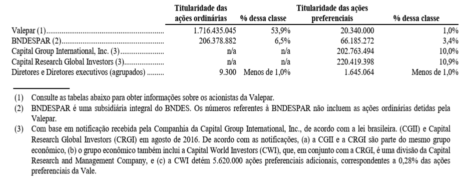 A Tabela 1 apresenta informações sobre a titularidade das ações da Vale pelos acionistas que detinha em benefício mais de 5% de qualquer classe do capital social em circulação, bem como o total detido de forma agrupada por diretores e diretores executivos, em 31 de dezembro de 2016.