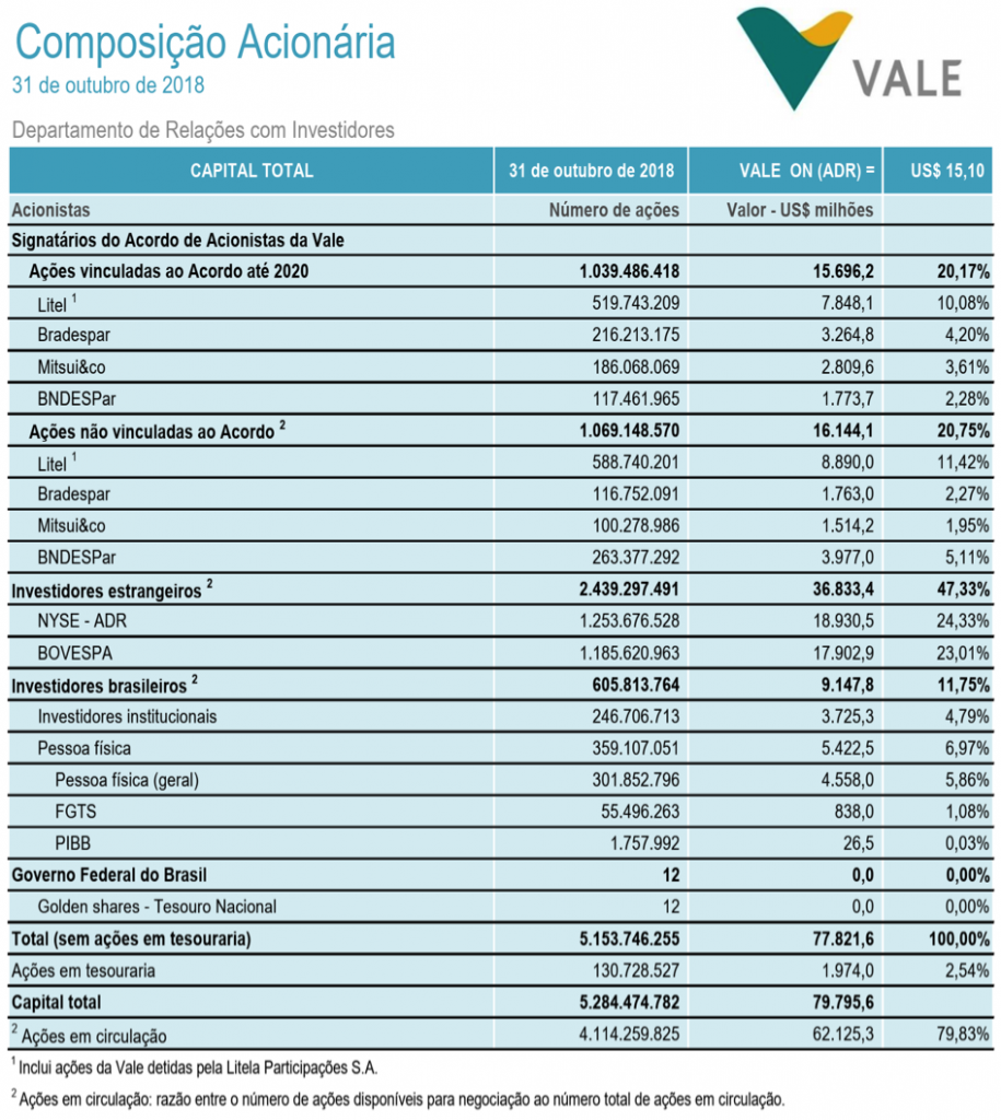 A migração para o Novo Mercado, em conjunto com a conversão das ações preferenciais classe “A” em ordinárias já realizada, segundo a Vale, reforçam o compromisso com elevados padrões de governança corporativa, além de trazer benefícios aos acionistas com uma estrutura societária simplificada e com uma maior liquidez das suas ações. A Tabela 3 mostra a composição acionária da Vale em 31 de outubro de 2018.
