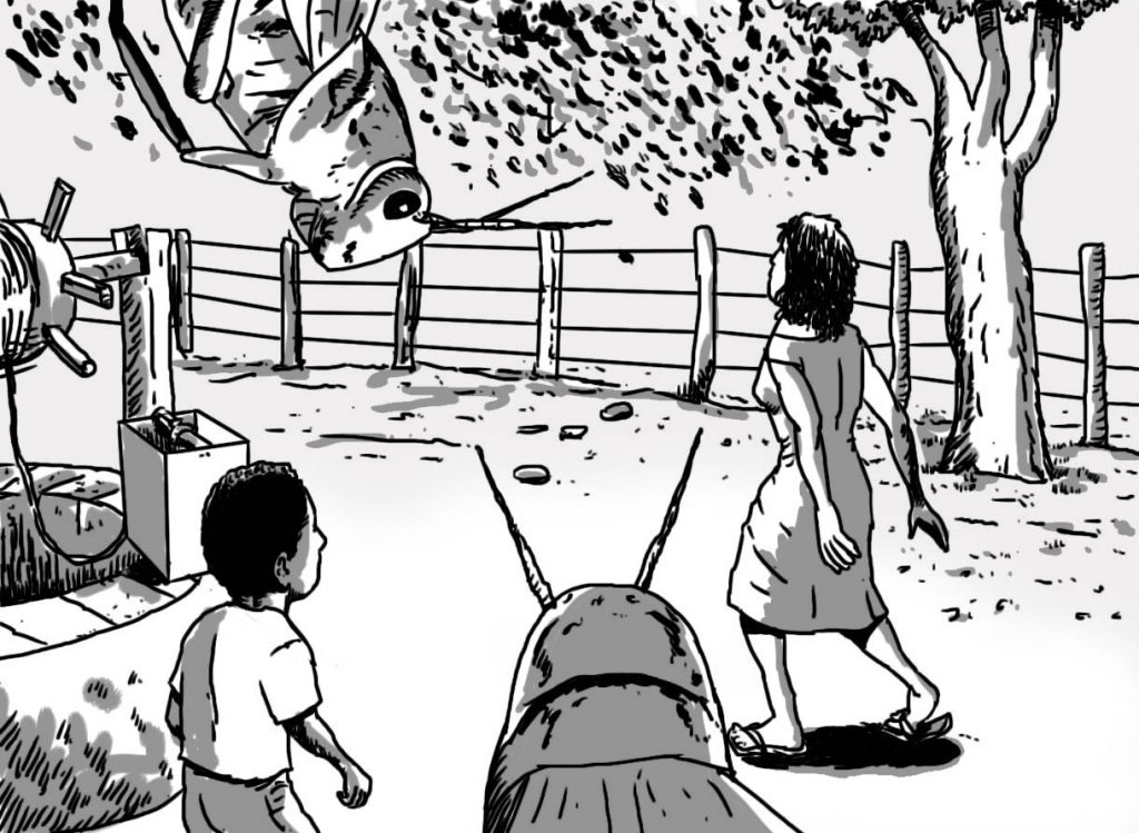 Uma vez sai para passarinhar com o meu irmão. Ele era craque na baladeira. Andávamos pelo cerrado, cerca de meio quilômetro de casa, quando encontramos um boi morto. Aquilo me chamou muito a atenção. Olhei aquele bicho enorme caído, já fedendo, com urubus à volta. Quando nos viram, voaram, mas ainda ficaram por perto, agitados, ainda muito interessados na refeição. Com a curiosidade sempre aguçada, passei os olhos desde os chifres até as patas. Nunca tinha visto algo tão grande assim, morto. Depois de alguns minutos, meu irmão chamou-me para seguirmos. Andamos mais um pouco e voltamos com algumas rolinhas fogo-apagou no mocó.