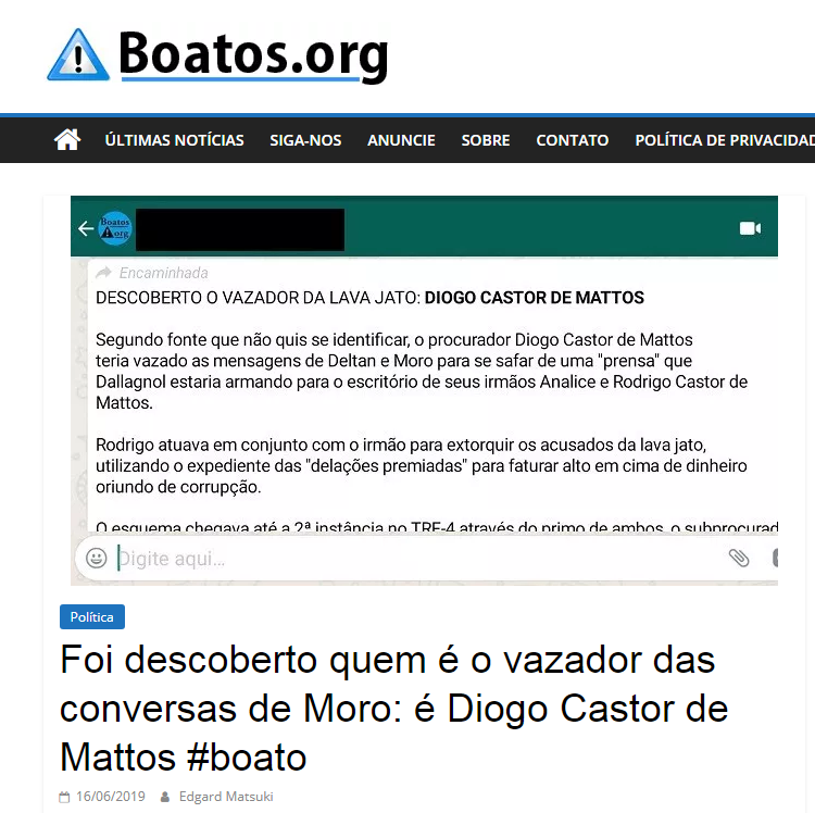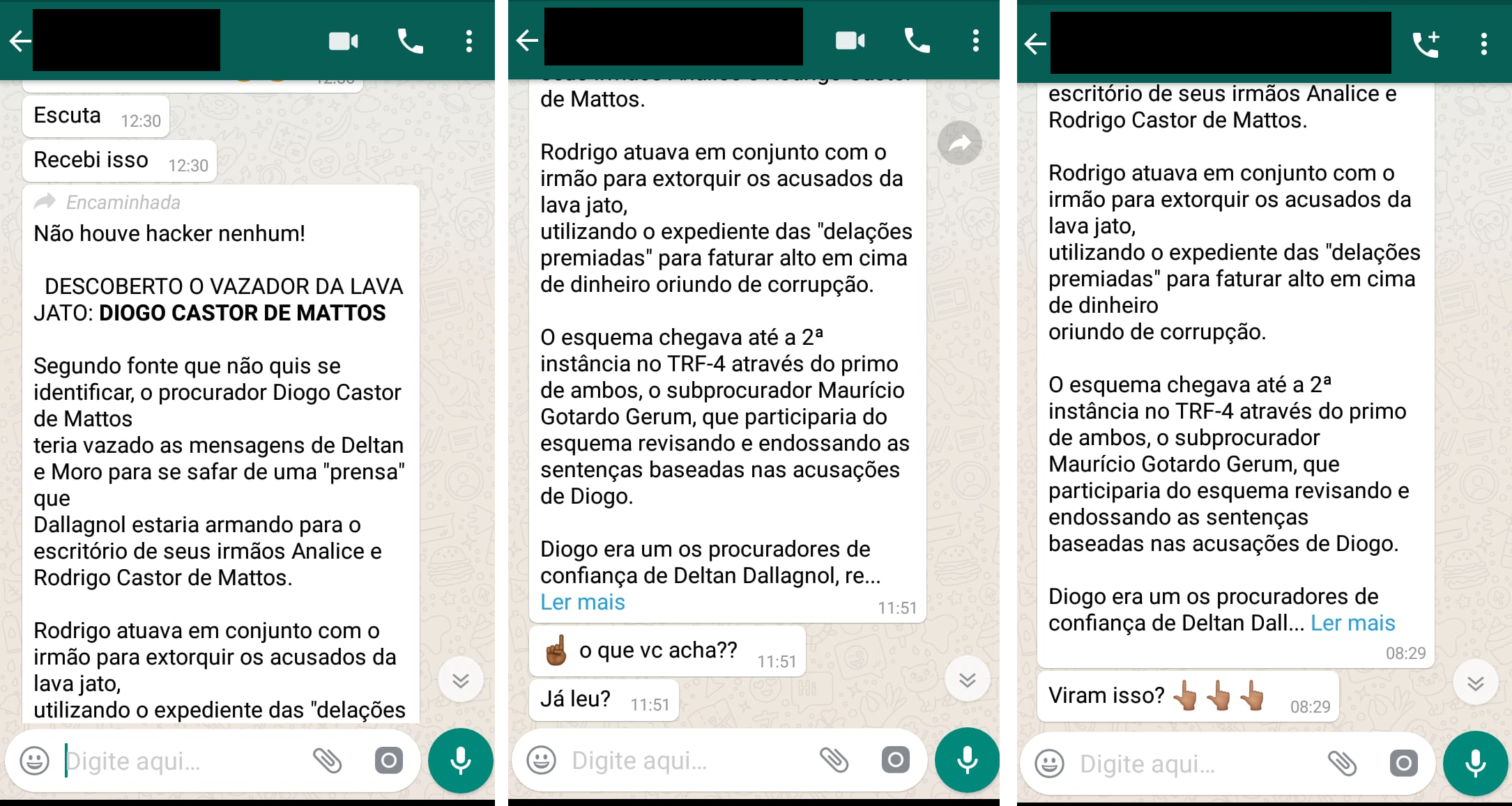 7.2.3) Eis que, sem mais, nem menos, um texto apócrifo (mas muito bem elaborado) viralizou, por meio do whatsapp, afirmando que o responsável pelo vazamento seria o procurador Diogo Castor de Mattos, devido a ameaças e pressões que vem sofrendo por ter participado, com seu irmão, de um esquema de venda de delação premiada. Esquema antigo e já denunciado e comprovado por Tacla Duran, além de intensamente repercutido pelo Duplo Expresso, enquanto outras mídias e lideranças petistas fizeram enorme esforço para esconder, infelizmente.
