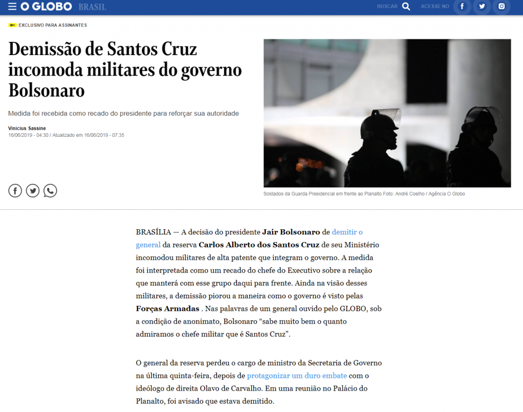 > https://oglobo.globo.com/brasil/demissao-de-santos-cruz-incomoda-militares-do-governo-bolsonaro-23743266