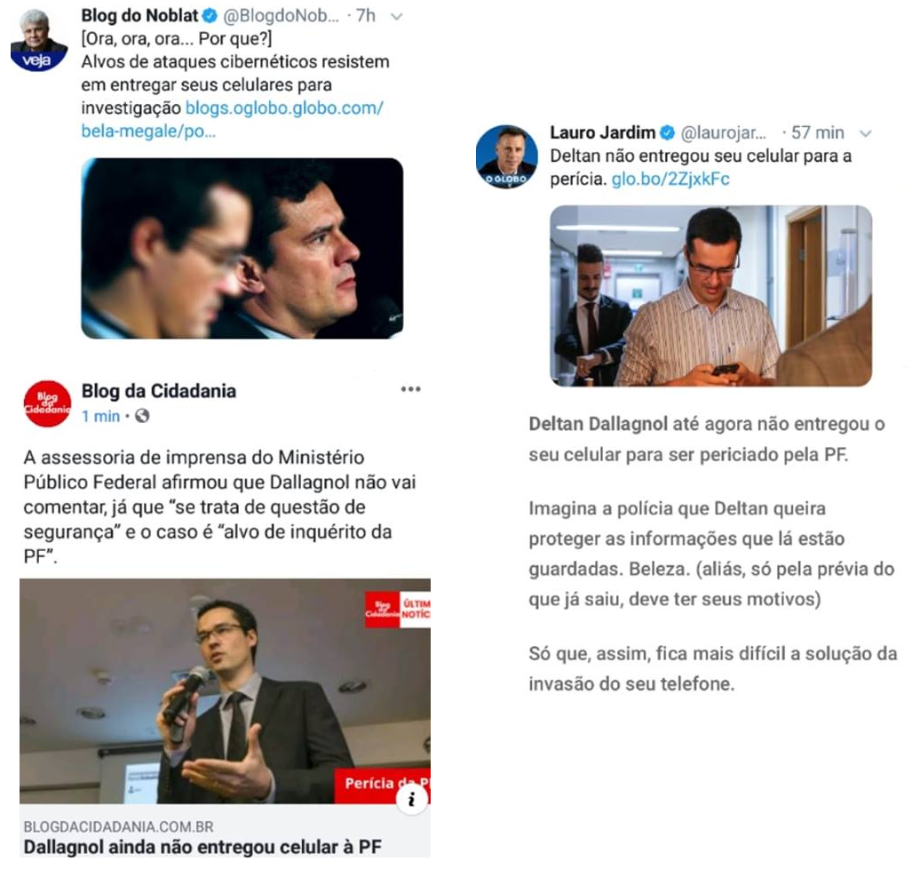 7.2.1) No entanto, o blog Duplo Expresso, por meio de Romulus Maya, desmontou tal delírio com um simples e genial contato, via twitter, com a empresa de comunicação Telegram, que, prontamente, negou qualquer invasão hacker em seu sistema. Tal fato pautou toda mídia, tradicional (PIG) e alternativa, que teve que redesenhar os caminhos investigativos e analíticos a seguir.