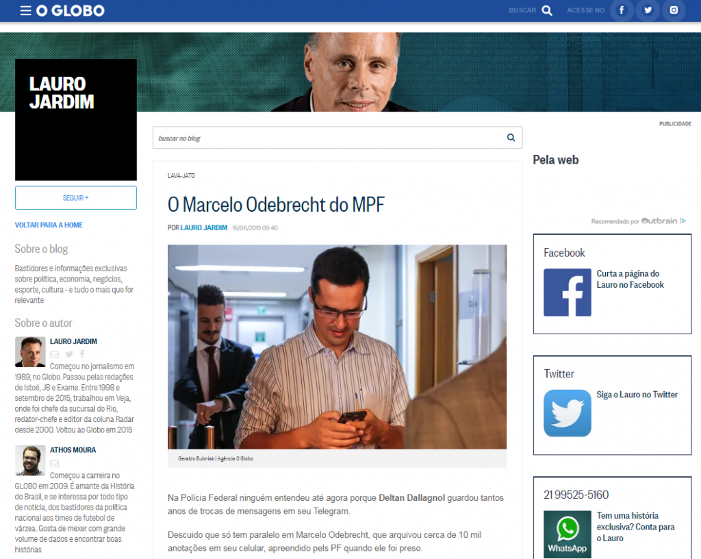 “O Marcelo Odebrecht do MPF – POR LAURO JARDIM – Na Polícia Federal ninguém entendeu até agora porque Deltan Dallagnol guardou tantos anos de trocas de mensagens em seu Telegram. Descuido que só tem paralelo em Marcelo Odebrecht, que arquivou cerca de 10 mil anotações em seu celular, apreendido pela PF quando ele foi preso.”