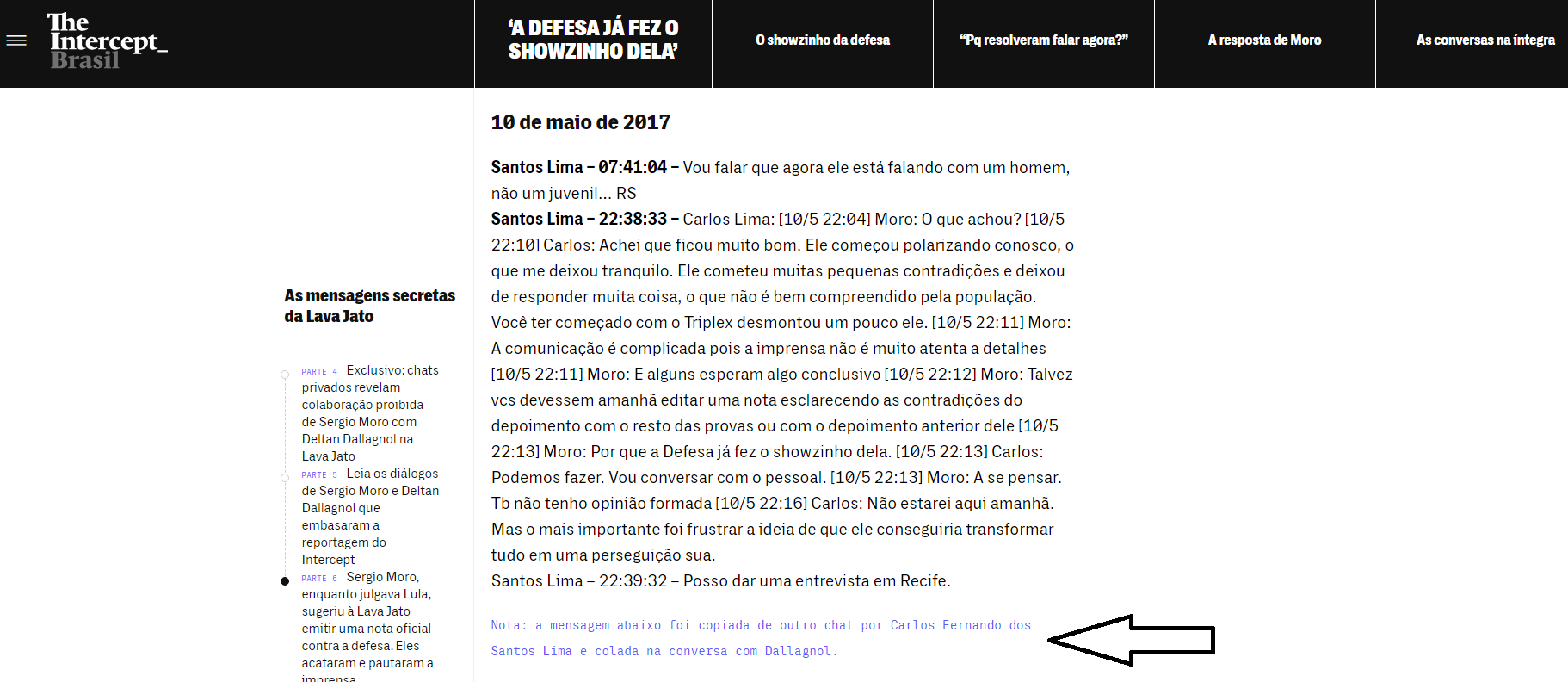 7.1.3) Para desavisados e habituados a ler somente manchetes e textos garrafais, ficaria a constatação de que Dallagnol não é a base de todo material vazado, não é mesmo? Porém, meu olhar calejado de bordoadas da guerra híbrida flagrou, ao final da matéria, na integralidade do material bruto, que, ao invés do que The Intercept tentou emplacar, tal diálogo só chegou às mãos dos seus jornalistas porque Santos Lima encaminhou o mesmo para… Deltan Dallagnol! Ora, Ora…