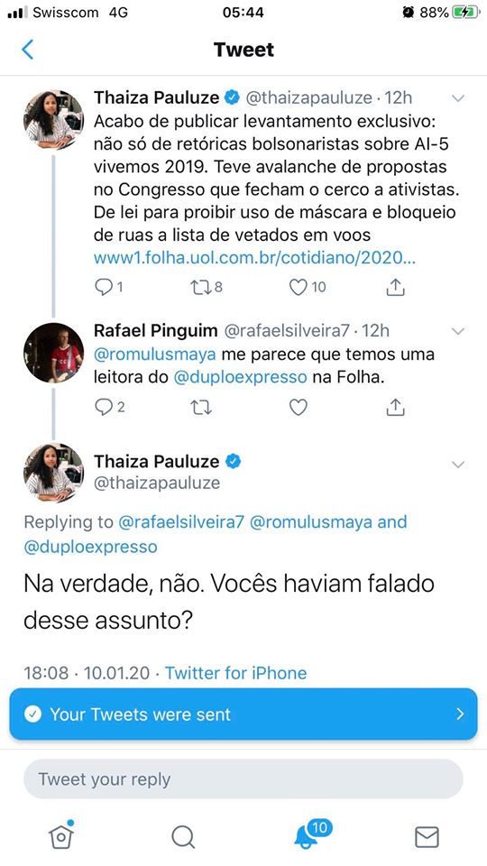 Apesar desse grande mérito, o artigo de Pauluze se pauta pela superficialidade. Não bebe de fonte primária – os projetos em andamento no parlamento – apenas cita -algumas matérias, publicadas na própria Folha ou em seu portal Uol, que falam de atividades parlamentares ou de repressão aos movimentos sociais. Em conversa direta no Twitter com Romulus Maya e mais Expressonautas (FIGURA 1), mostrou-se surpresa em saber que mais gente se ocupava dessas denúncias, embora ainda não indicasse fontes ou de onde extraiu os dados que utiliza na matéria.