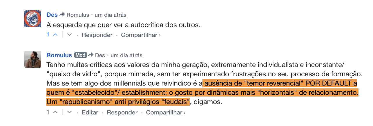 Mas se tem algo dos millennials que reivindico é a ausência de ‘temor reverencial’ POR DEFAULT a quem é ‘estabelecido’/ establishment; o gosto por dinâmicas mais