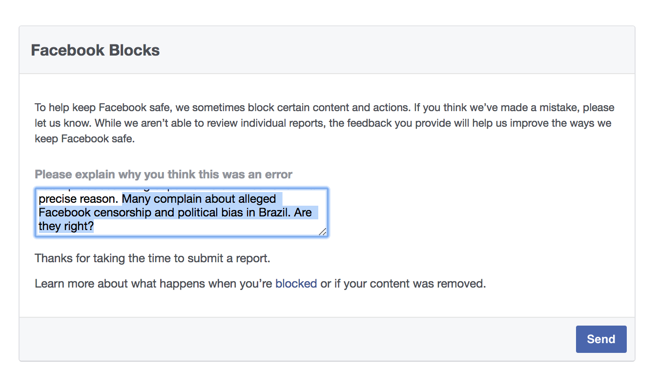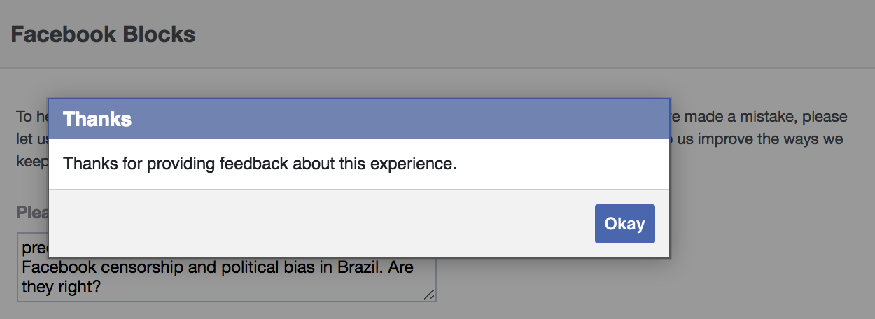 censorship and political bias on the part of the Brazilian branch of Facebook (Facebook São Paulo) – which is paid hundreds of millions of US dollars by a corrupt government that usurped power after a coup d’état.