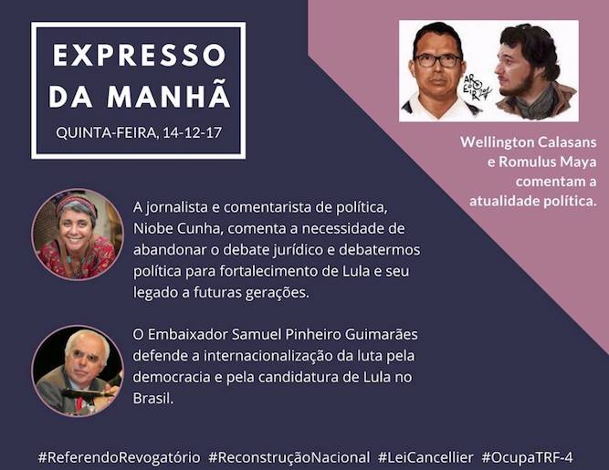 O Embaixador Samuel Pinheiro Guimarães, comentarista fixo do programa, ressalta a importância de internacionalizar a luta pela democracia no Brasil. Ele revela que escreve, de próprio punho, declaração em defesa (i) da democracia no Brasil; (ii) da realização de eleições livres e limpas em 2018; e (iii) do direito do povo de votar em Luis Inácio Lula da Silva se assim o quiser. O documento será subscrito por lideranças políticas de todo o mundo e por personalidades comprometidas com o humanismo e a democracia, como prêmios Nobel da Paz.