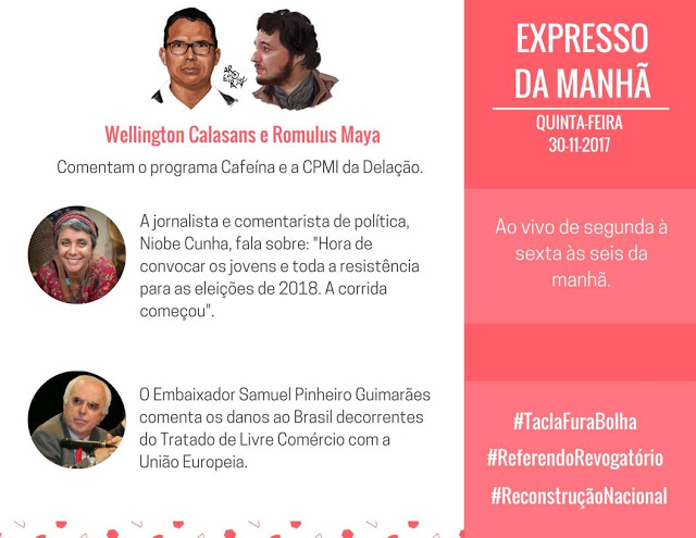 #TaclaFuraBolha; colonização do Brasil pela UE; jovens na política: EXPRESSO DA MANHÃ 30-11-17 0 min de leitura Programa integral: * Extrato (1): * Extrato (2): * Áudio do programa (integral): Facebook Comments