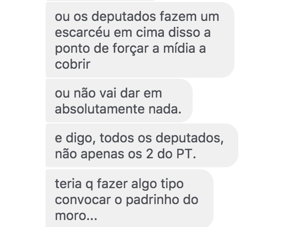3.11.2017: Começa a reação, da L-J e da “imprensa oficial”. Na Folha, a notícia de que as dificuldades em extradições “atrasam Moro”. Como sabemos, a justiça espanhola não é a brasileira, e não entregou um cidadão de seu país para mofar na masmorra, estratégia que Moro utiliza para aqueles de quem ele não quer ouvir nada. Matéria inócua, vários cometários à notícia revelaram que leitores perceberam a manobra. Mais tarde, ela iria focar nessa coisa ridícula de ex-Bonner namorando socialista. Mais tarde, o Estado de SP produziu um contra-ataque mais eficaz. Veio a história das alianças entre PT-PMDB para as próximas eleições (a notícia foi desmentida pela Gleisi…). Isso foi replicado pelo Globo e pela Folha hoje (4.11.2017). Ao mesmo tempo, o procurador Carlos Fernando, ao meu ver o mais implicado por TD, solta um ataque ao paulo Pimenta, com aquele velho argumento: “a organização criminosa se junta para frear a L-J”. Pimenta responde, e ainda dá o troco: será que tudo isso foi porque via lei de acesso à informação se obteve, através do próprio MPF, a informação que ele obteve em diárias e passagens, de 2013 até agora, R$ 429.000,00?