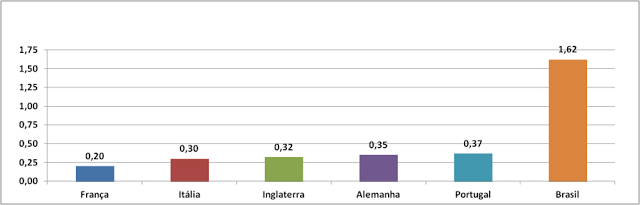 Na comparação com países europeus para os quais havia dados disponíveis, a proporção das despesas tendo como base o PIB é muito elevada. Situa-se, por exemplo, 16 vezes acima daquela observada em países como a Alemanha (uma diferença de 1.500%!).