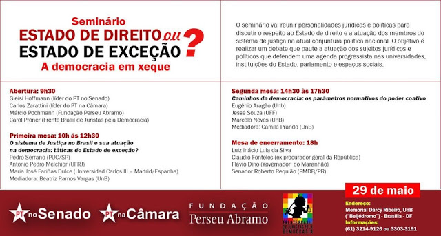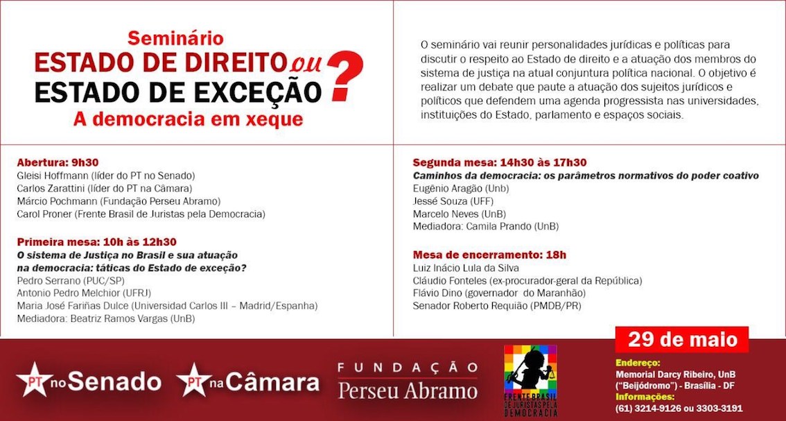 Juristas, políticos, estudantes e membros da sociedade civil, reunidos em Brasília, no dia 29 de maio de 2017, no Memorial Darcy Ribeiro – Universidade de Brasília-UnB, por ocasião da realização do Seminário “Estado de Direito ou Estado de Exceção? A Democracia em Cheque” promovido pela Fundação Perseu Abramo e pela Frente Brasil de Juristas pela Democracia, e com o objetivo de debater e refletir sobre o Estado Democrático de Direito e o Sistema de Justiça na atual conjuntura da política brasileira, vêm a público manifestar grave preocupação com o uso excessivo da excepcionalidade jurídica por membros do Ministério Público e do Judiciário, fraturando a essência constitucional e convencional das garantias do Justo Processo e dos princípios elementares que o acompanham em qualquer sociedade democrática.