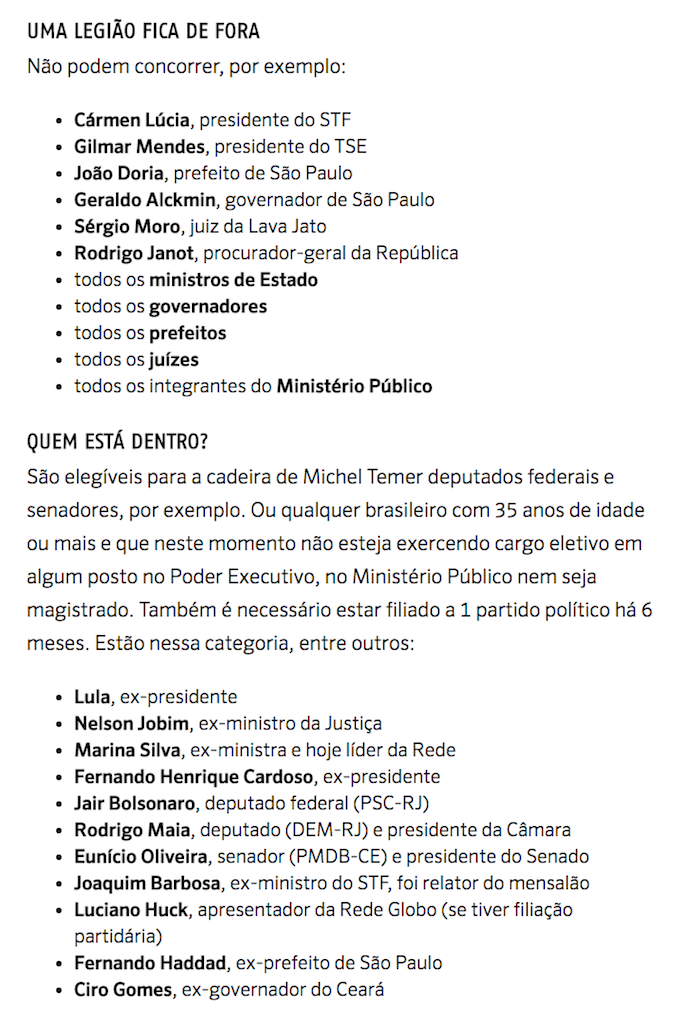 ” 2015 foi promulgada a lei que pode ser com eleições, se for mais de seis meses para a eleição normal. Está em plenário no STF para julgar se aplica a lei neste mandato. Se não for ‘Maria vai com as outras’ o STF falará que é válido porque lei é lei como o ilustre Jair (Bolsonaro?!) informou no vídeo. Portanto “Diretas já”. E, pessoal, vamos votar com consciência: envolvidos em corrupção não terão meu voto. E o partido e candidato com melhor proposta protegendo o povo será votado. Lembre-se: corrupto não mais”