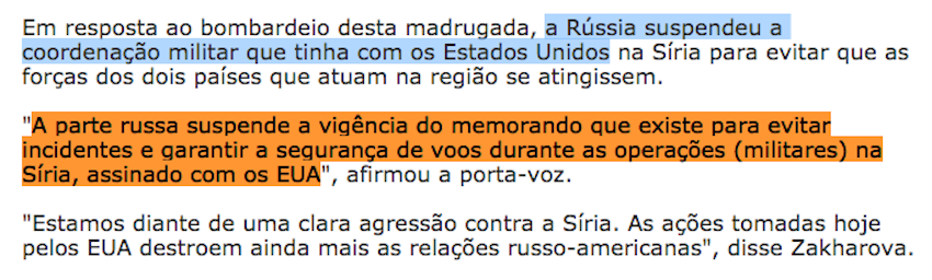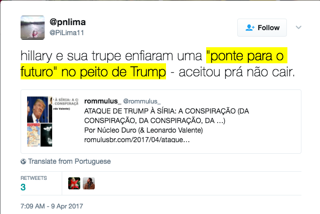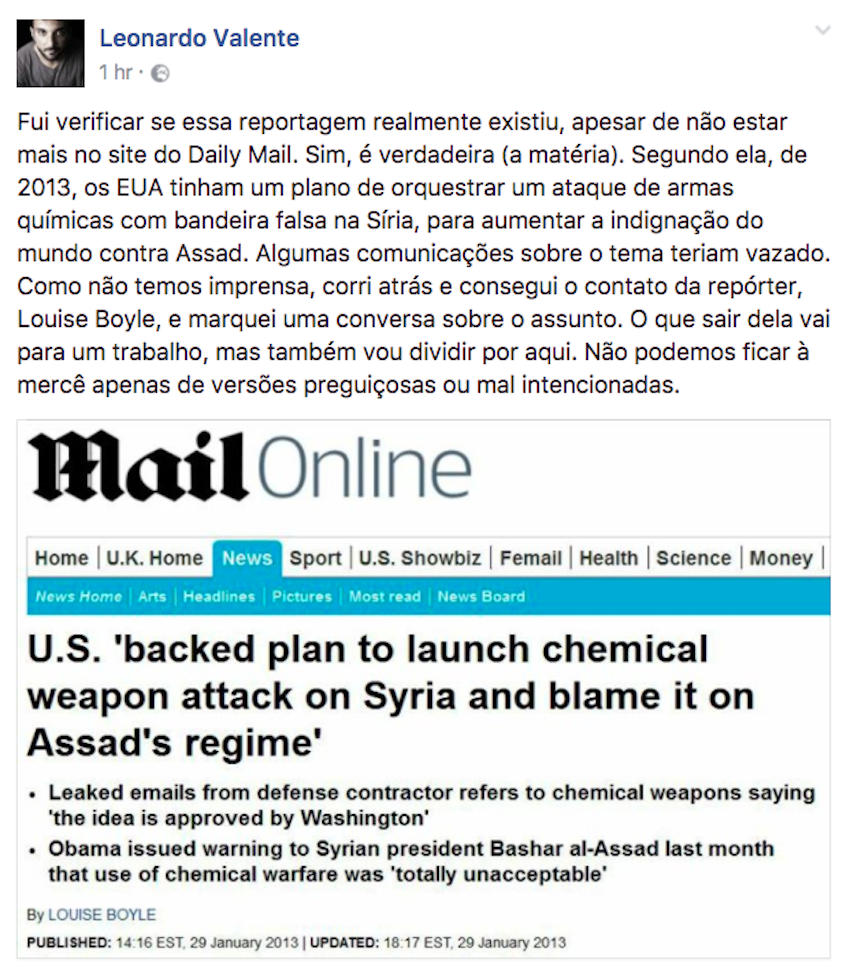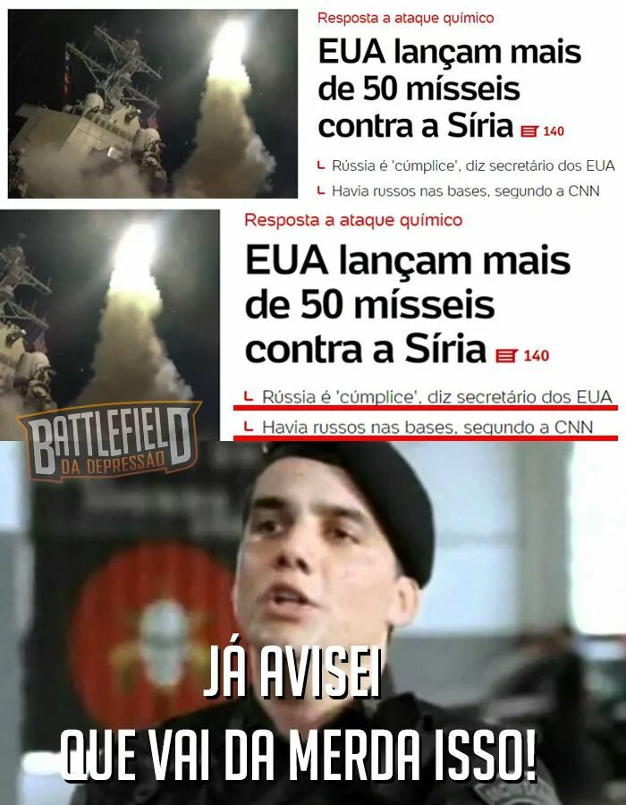 Piero: Bom, como complemento a isso, acabo de ver um post de um amigo (diplomata) com uma notícia do Washington Times (?) em que uma emissária da ONU tem fortes evidências que o ataque com gás sarin partiu dos rebeldes, e não do governo. Se a ONU confirmar essa versão, aí é que o CS vai pro buraco mesmo (porque Trump não vai recuar: e isso, para mim, é a parte da velha estratégia de marketing de guerra: tá ruim em casa, arruma briga fora; além disso, para o americano médio isso “provaria” que Trump não tem nada a ver com os russos [e, se Trump pensou assim, a chance dos seus eleitores também elaborarem esse raciocínio é alta, né não?].