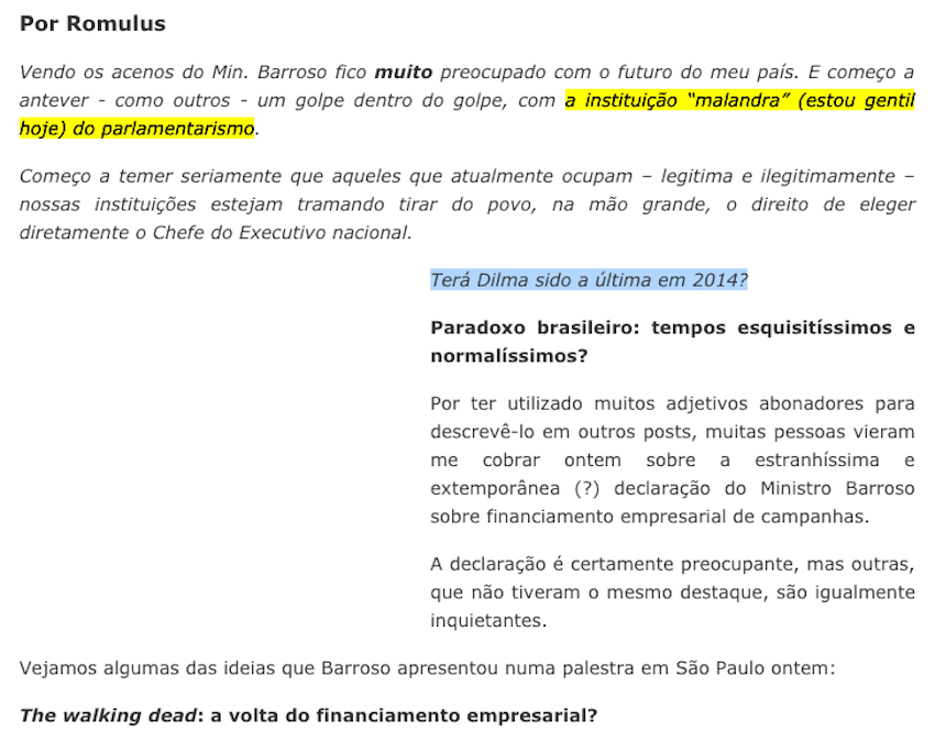 Mas não na versão “tropical-carnavalesca” do Min. Barroso… que está mais para Parlamentarismo puro, com uma Rainha Elisabeth qualquer (um Lula?) no Palácio do Planalto, “reinando mas não governando”.