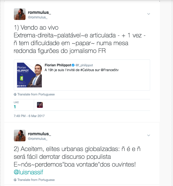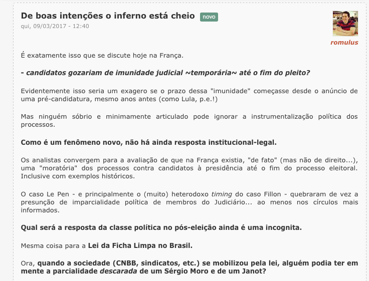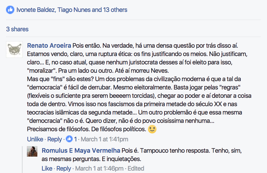Romulus conclui o post falando dos “aristocratas” que falam do alto do seu saber em Estado democrático de direito” e daqueles a quem falta “malandragem” pra ver que sempre se pode dar um “jeitinho” de dar um golpe e fingir que “as instituições continuam funcionando normalmente”. Pois eu acho que de ambos os lados se continua a pensar como se Maquiavel nunca tivesse existido, e nem o velho Karl que explicava a relação entre infraestrutura econômico-social e “superestruturas jurídico-políticas”… Querer impor uma discussão “ética” separada da lógica das relações de poder dá nisso. Quer pensar ética em relação ao poder? Leia a 2a. parte do Príncipe. São horríveis conselhos “maquiavélicos”? Só pros moralistas de plantão. Eles levam em conta precisamente as relações intersubjetivas na per-cep-ção das relações de poder. Não basta o Bolsonaro “ser” um bandido fascista, se “parece” aos olhos dos seus adeptos combater os bandidos para defender a família. Não adianta Lula “ser” o melhor presidente que o Brasil já teve se agora “parece” aos olhos dos manipulados pela mídia o chefe de quadrilha que quebrou o país. Não há “ética” absoluta nem “Direito” que dê jeito nisso que vocês chamam de “dissonância cognitiva” e que eu chamo de “ideologia” em ação, segundo suas regras próprias de funcionamento.