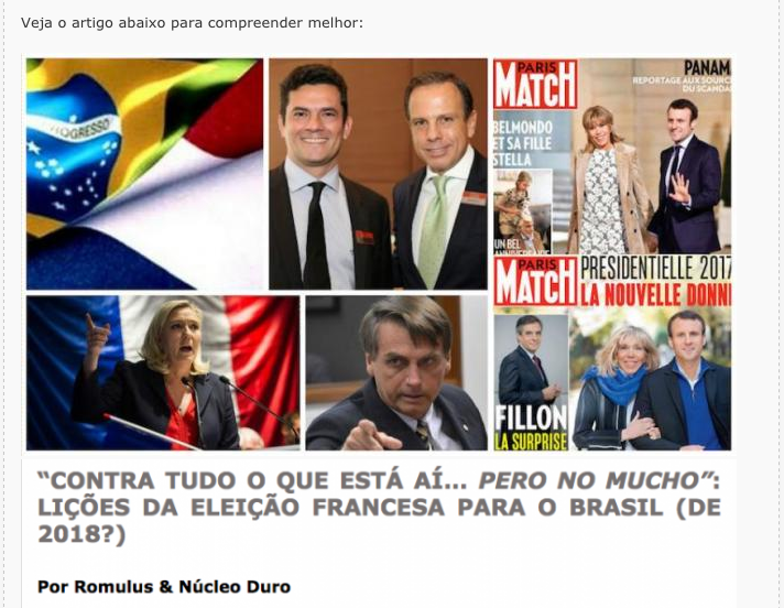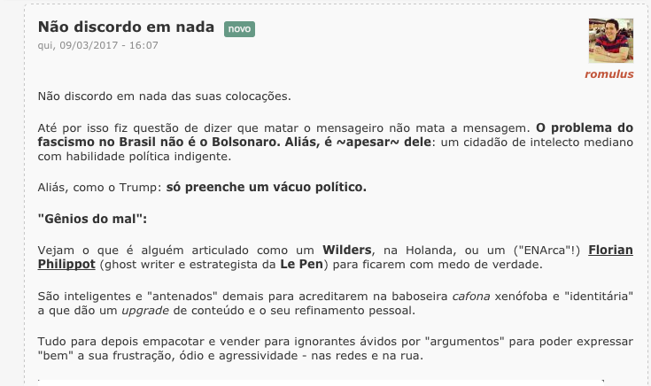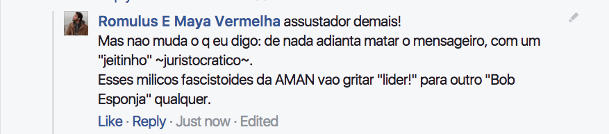 Maria: Acho que Romulus está “republicanamente” (e estrategicamente) certo. Mas concordo com o Piero que o episódio da AMAN é apavorante. Viúvas de 64, generais de pijama e a “gayzada” enrustida que venera o “mito”, além de uma pequena burguesia atavicamente conservadora que defende “a família” e os reacionários evangélicos de todo tipo – é uma coisa. Outra muito diferente é a corporação portadora legítima de armamento de guerra homenageá-lo através da AMAN e portanto, como Piero enfatiza com razão, com o aval de toda a cadeia de comando. Esse não é um ator político qualquer e no momento ninguém além de Bolsonaro tem o poder de catalisar sua adesão. A própria história dele é significativa – e insubstituível – mostrando por onde deve ter-se dado a “conversão” das FFAA que as manteve imóveis diante do processo de cassação do poder democrático legítimo desse país.