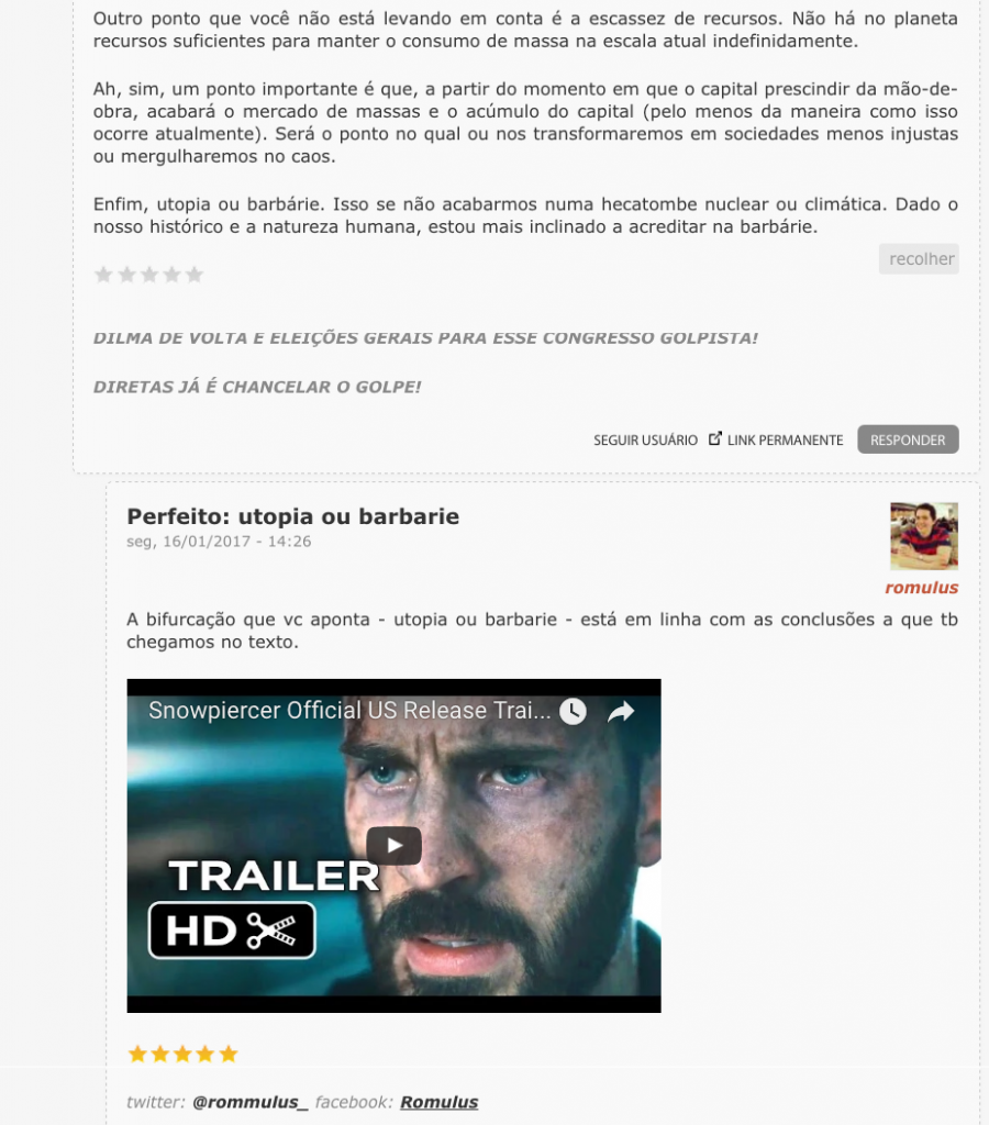 Piero – Bom, só pra lembrar, pro Marx pelo menos o fim do capitalismo estava contado pela tendência decrescente da taxa de lucro, quando o capital fixo (máquina) sistematicamente se sobrepõe ao variável (mão de obra). Bola cantada lá atrás… De todo modo, ele achava que isso ia ser libertador, pois a mão de obra ia se recompor de novo numa relação “totalizante” com a produção – fim da alienação – na medida em que, liberado da prisão que a condição de força de trabalho impunha, o proletariado poderia finalmente vislumbrar a revolução. Mas, enfim, o que vemos: o contrário; a transformação progressiva do proletariado em lumpen-proletariado, e a alienação total da produção, consagrada pela autonomia absoluta do meio circulante do valor gerado pelas horas de trabalho social gastas no mundo. Agora, se é o fim da classe trabalhadora, também é o fim da burguesia: afinal, uma só existe em relação à outra. Se o mundo vai ser habitado pelo lumpesinato, é certo que o extra-mundo vai ser habitado pela lumpen-burguesia: Elisyum, enfim, como diz o nobre Romulus…