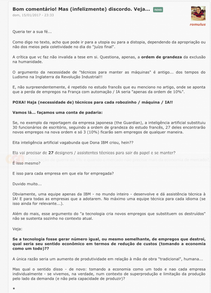 Renato – Reações? Ué, concordo… Ou, pelo menos, me parece muito possível, muito verossímil. Também acho que no futuro do Capitalismo (que significa, basicamente, riqueza concentrada), existe um troço assim… Parece spockianamente lógico: a economia de mercado servia para extrair mais valia, e pra arrancar o que sobrou vendendo pros mesmos imbecis. Se robôs produzirem tudo, se não for necessário o trabalho (ou o consumo) da ralé, pra que serve gente pobre? Pra nada.