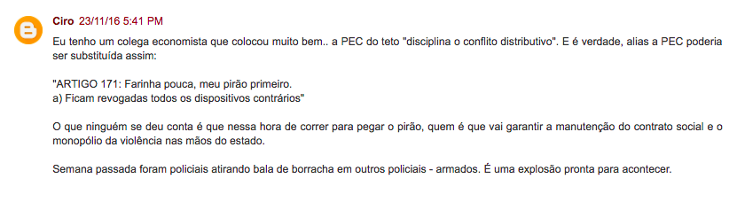 – Nova denominação: a PEC do “farinha pouca, meu pirão primeiro”.