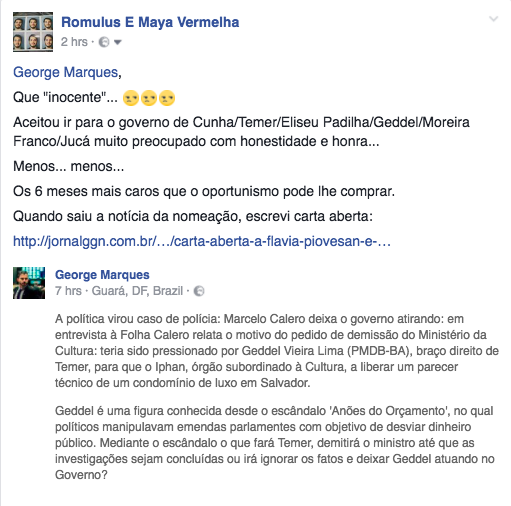 Na verdade, lamentou-se muito mais a aceitação [de Flávia Piovesan] do convite do que aquela de um egresso da UERJ e da diplomacia – Marcelo Calero – para a Secretaria da Cultura. Calero é pessoa totalmente alheia à área cultural.