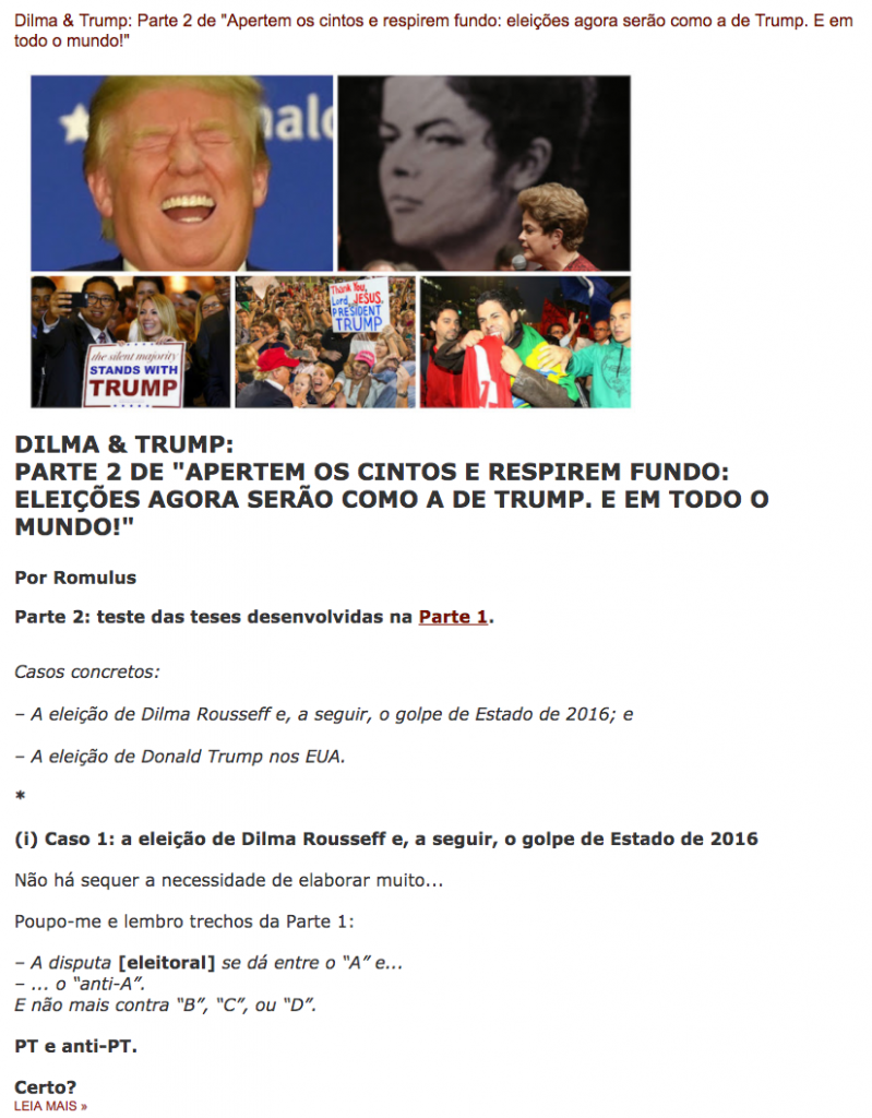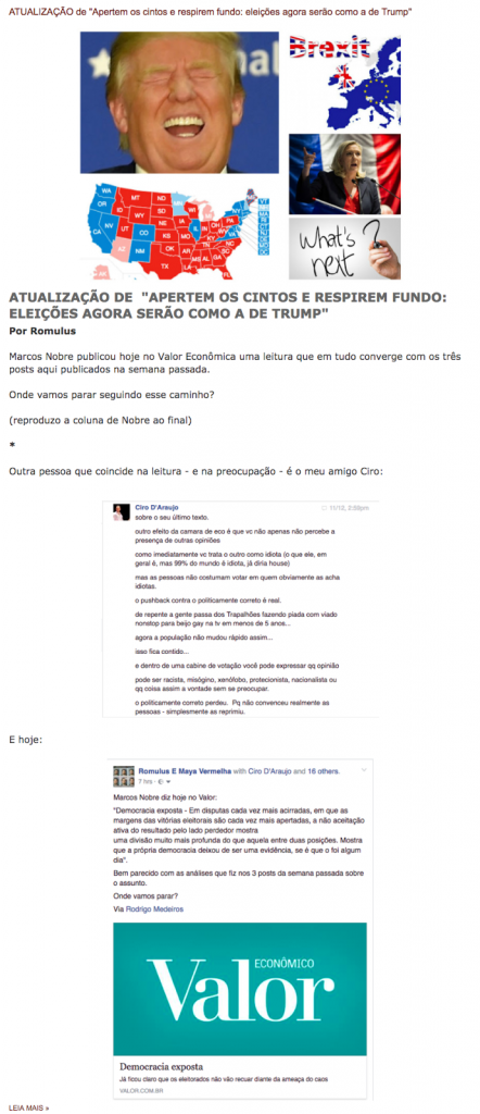 Em introdução no Facebook ao seu compartilhamento do Post “ATUALIZAÇÃO de ‘Apertem os cintos e respirem fundo: eleições agora serão como a de Trump‘”…