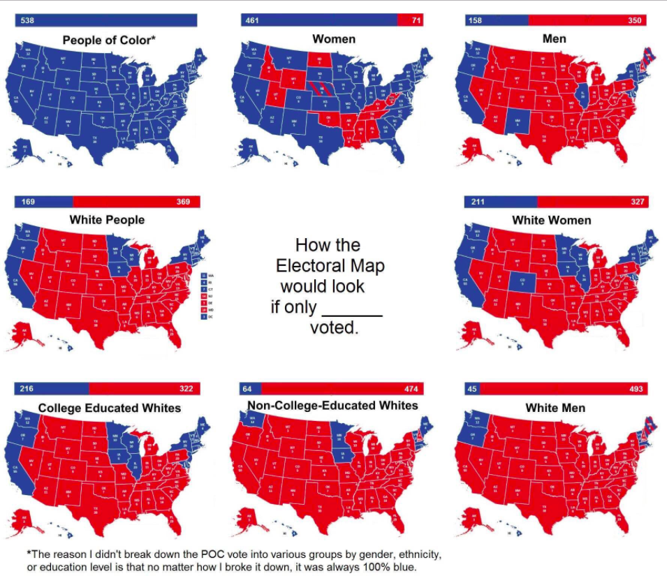 Ou seja: venceu o candidato do ~ homem + branco ~ contra a candidata das mulheres, dos negros e dos latinos.
