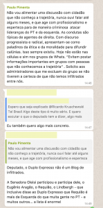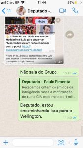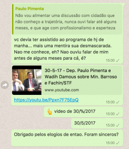(3) Diante da minha insistência em dar sequência à pauta, chega dias depois o parceiro dele, (bem) menos “safo”: com termos mais comprometedores e usando intermediário, sem se preocupar com o número de pessoas que tomariam conhecimento dessas “gestões”: