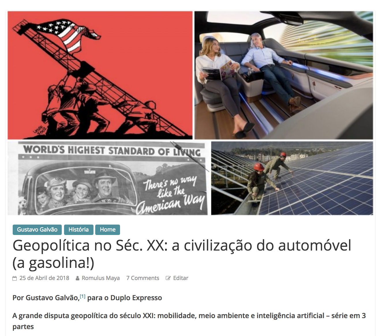 O último artigo, sobre a geopolítica do carro a gasolina, é uma explicação sobre como os EUA e outros países desenvolvidos resolveram o problema do desemprego após a Segunda Guerra Mundial quando milhões de soldados voltaram para casa e ainda tiveram que enfrentar o desemprego decorrente do fechamento de milhares de fábricas que produziam para a máquina de guerra.