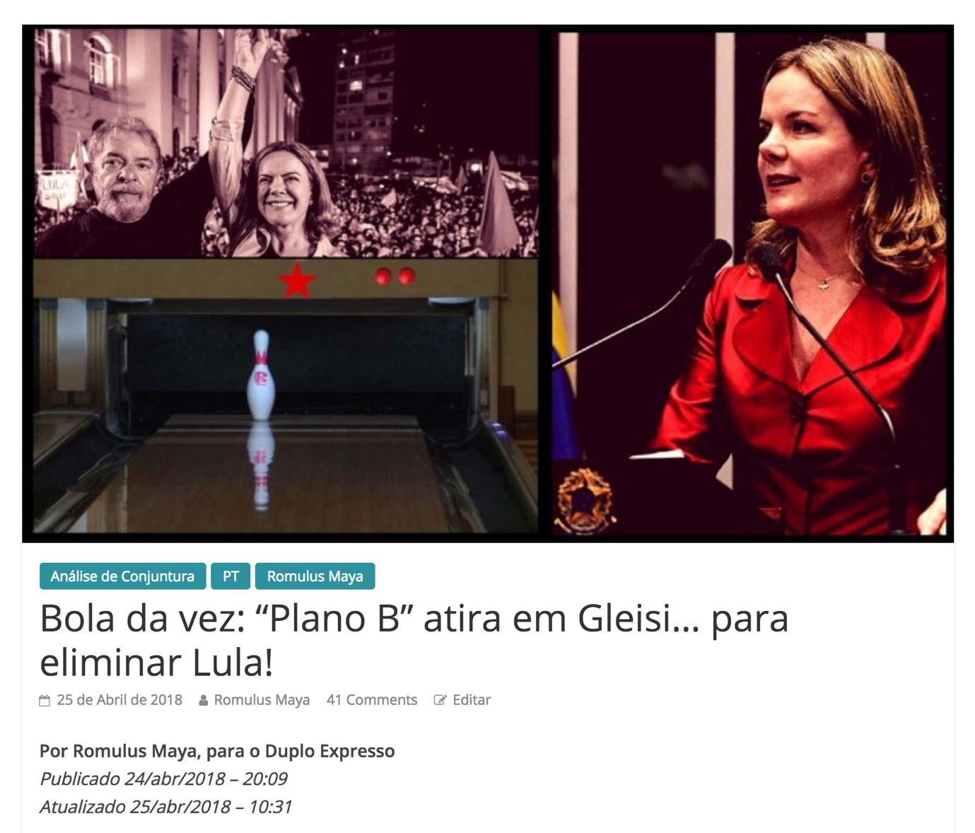 - Na verdade, o apoio a Lula em vez de arrefecer só faz é crescer. Com isso, o binômio Gleisi-Lula segue tendo em suas mãos a última cartada para tentarmos derrotar o Golpe nesta geração política: colocar em xeque o projeto de eleições fraudulentas – em que o Golpe deseja escalar os times… hmmm… “adversários” (aspas!), à direita e à “esquerda” (novas aspas!).