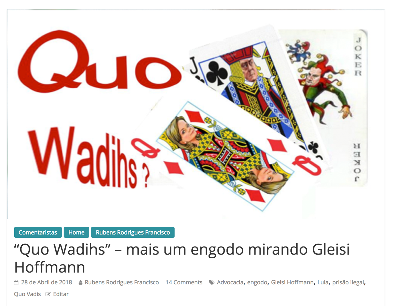 - Senadora Gleisi Hoffmann, não se deixe enganar por “interpretações” (sic) veiculadas na mídia engajada. Ou, no caso, até mesmo por conselheiros “jurídicos” (?) “de casa” (?). Aliás, seriam esses os mesmos “bons conselheiros” que afirmaram, no Sindicado em São Bernardo, que “em prisão preventiva não cabe habeas corpus por 81 dias”?! Hmmm… de fato “bons conselheiros”… mas para quem?