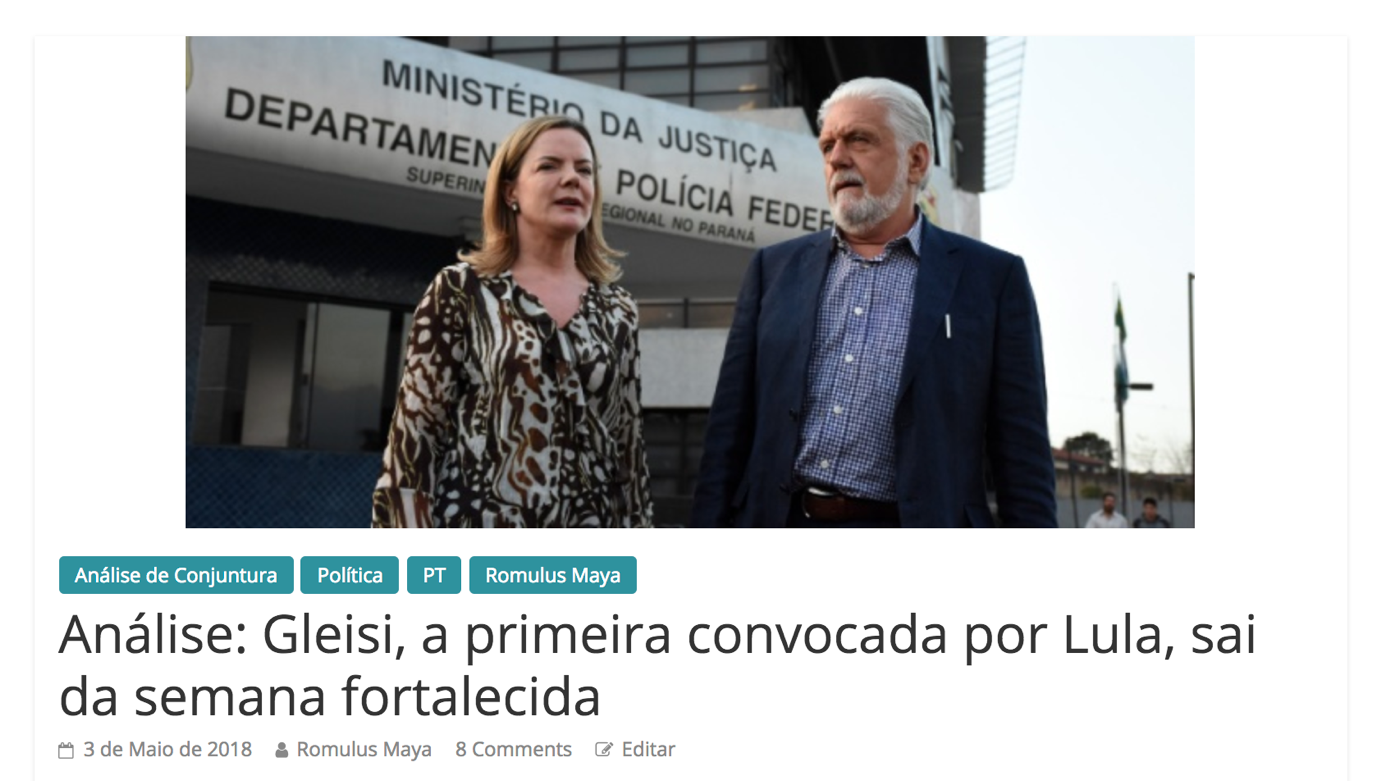 – Gleisi Hoffmann sai desta semana fortalecida dentro do PT. E, por tabela, sai também fortalecido aquele a quem ela tem dado sustentação na disputa que se trava dentro da sigla: o Presidente Lula. Ainda por tabela, sai também fortalecida a resistência democrática, que tem na candidatura de Lula – “até as últimas consequências” (apud Gleisi Hoffmann) – as suas melhores chances de sucesso contra o Golpe.