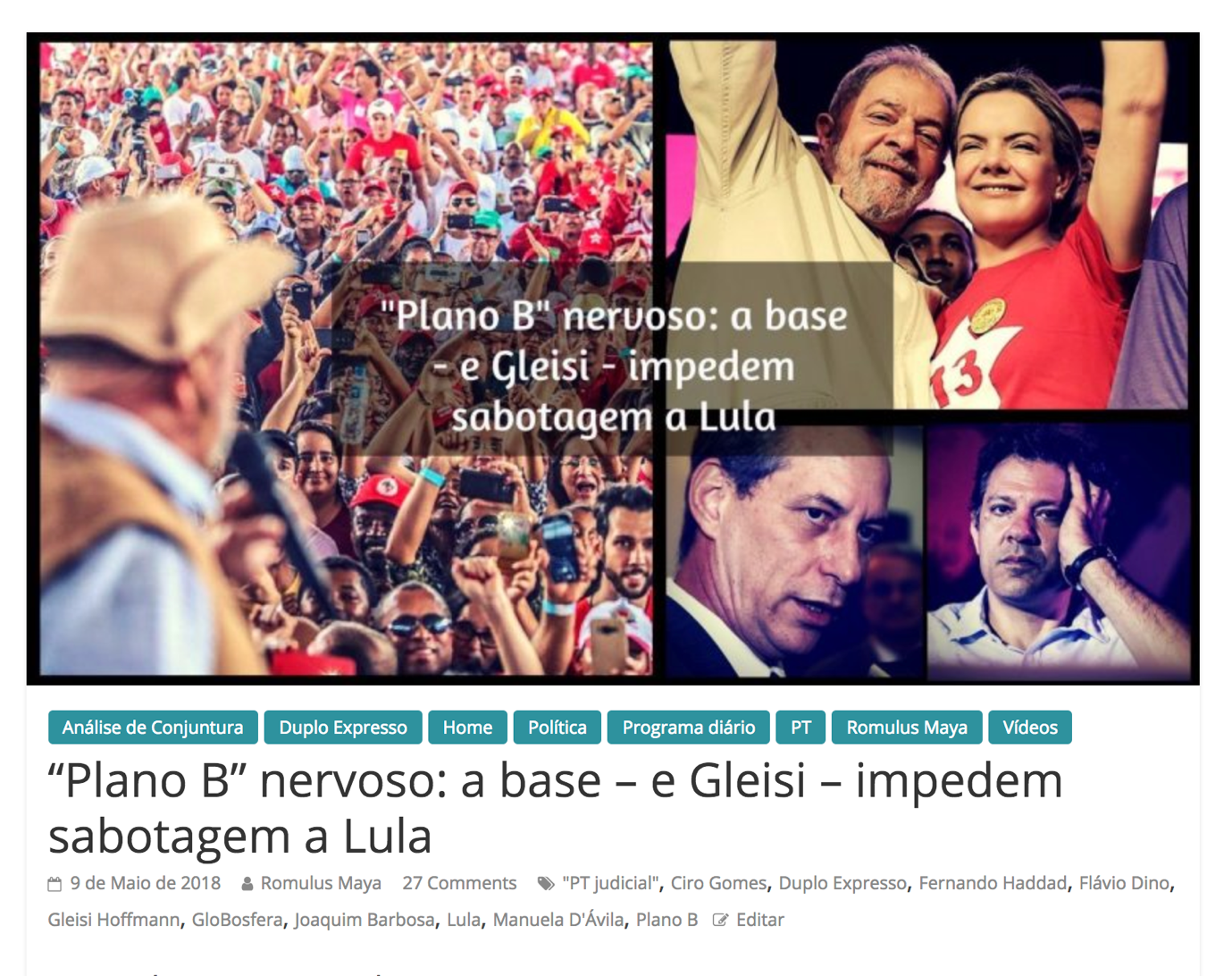 - Hoje vem o próprio Lula, em carta endereçada a Gleisi, defende-la dos ataques perpetrados pelos articuladores do “Plano B”. Ao reafirmar expressamente a sua candidatura pela boca da Senadora – i.e., mais uma vez – o Presidente prestigia a mesma, ratificando, para além de qualquer dúvida, a sua condição de única porta-voz e representante daquele que foi sequestrado pelo Golpe.