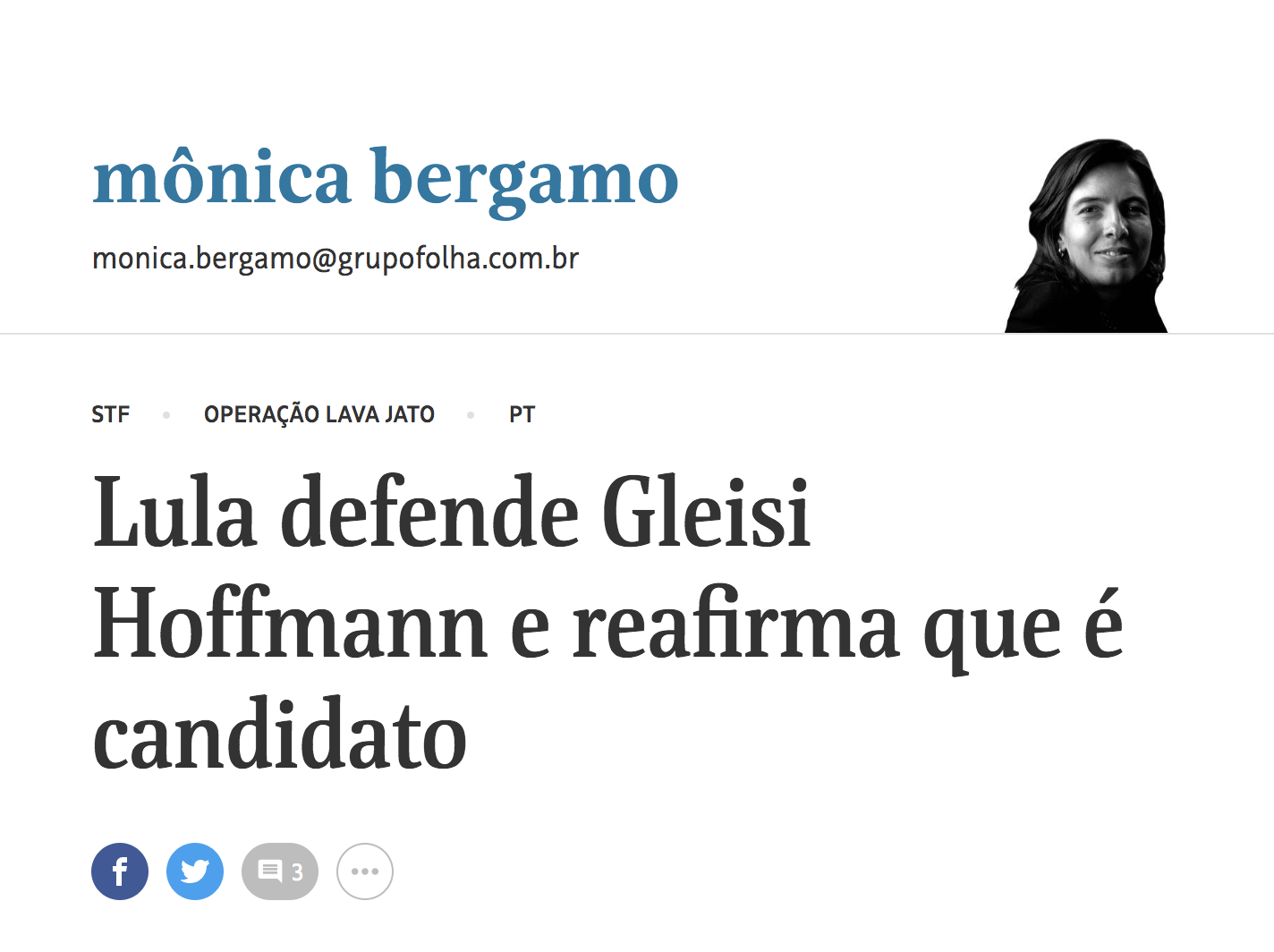 - Para nossa surpresa, contudo, somos obrigados a registrar como fonte da nova carta de Lula a Gleisi a mais notória “agro-jornalista” – aquela que vive de plantar “notinhas” – em atividade no PIG, o Partido da Imprensa Golpista: Monica Bergamo, da Folha de S. Paulo. Ora, trata-se da a plataforma preferencial para o lançamento dos seguidos balões de ensaio que tentam fazer o (pobre do) “Plano B” acontecer!
