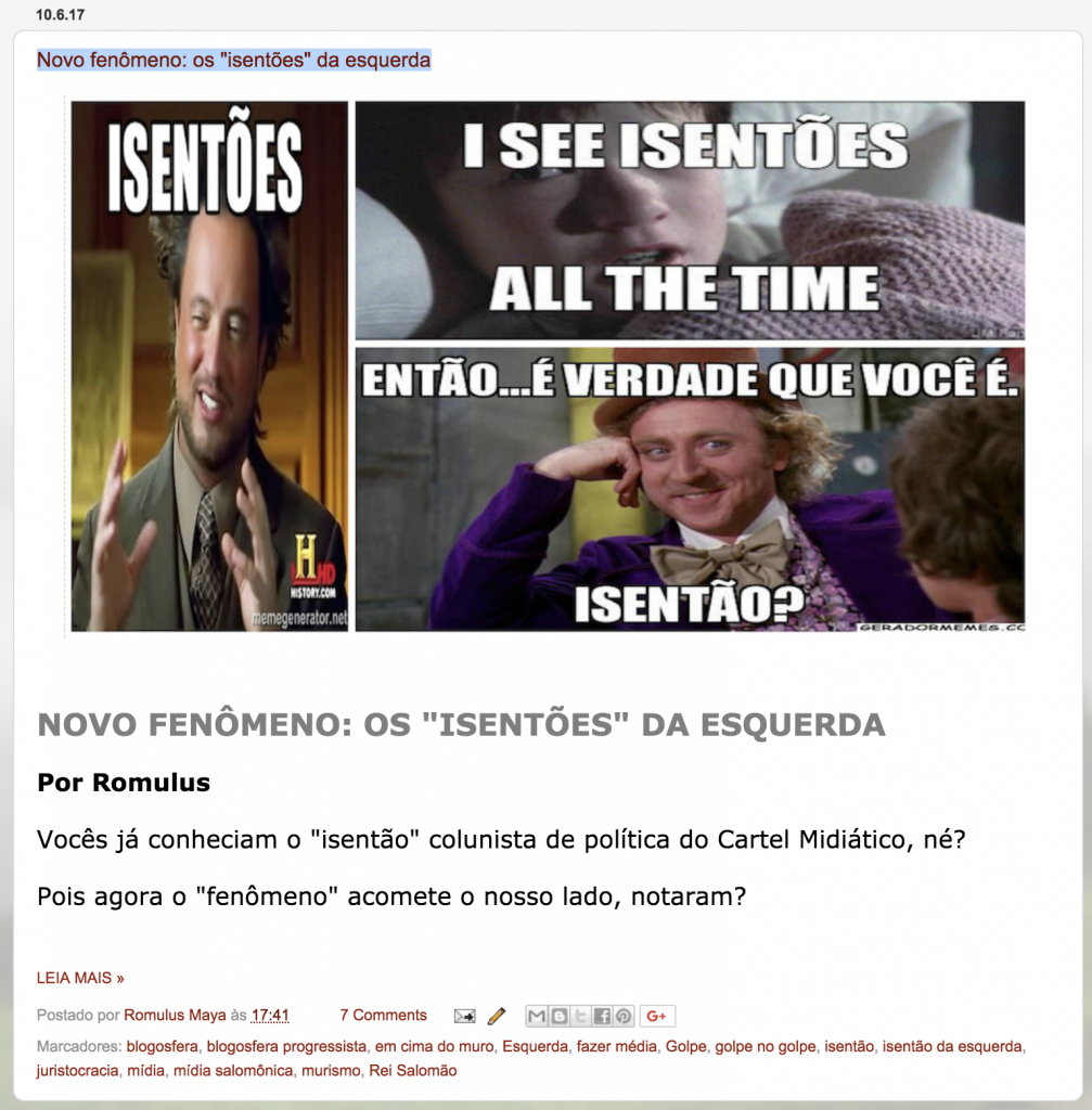 Aliás, (fulano, “isentão”,) lembra muito certas postagens do (…) Renato Janine Ribeiro (no Facebook), por exemplo.