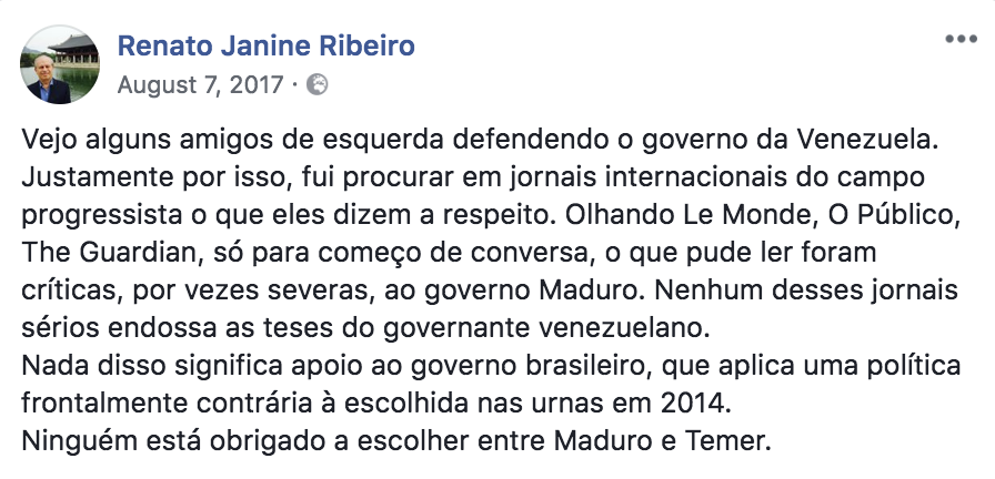 Como aquela em que ele “resolveu” (?) o dilema de ter de se posicionar com relação ao dramático conflito na Venezuela dizendo que “a constituinte venezuelana é golpe sim -porque os jornais europeus ‘de esquerda’ (?!) assim disseram – e eu não preciso escolher entre Maduro e…