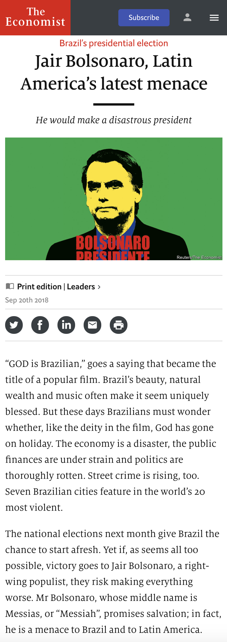 Notem a parte final da matéria da Economist, reproduzida acima, em que se comemora o teto de gastos imposto pelo Golpe e acrescenta-se que, para além dele, mais “reformas” seriam necessárias. Tudo isso para concluir que Bolsonaro não é o homem certo para entregar esse serviço.
